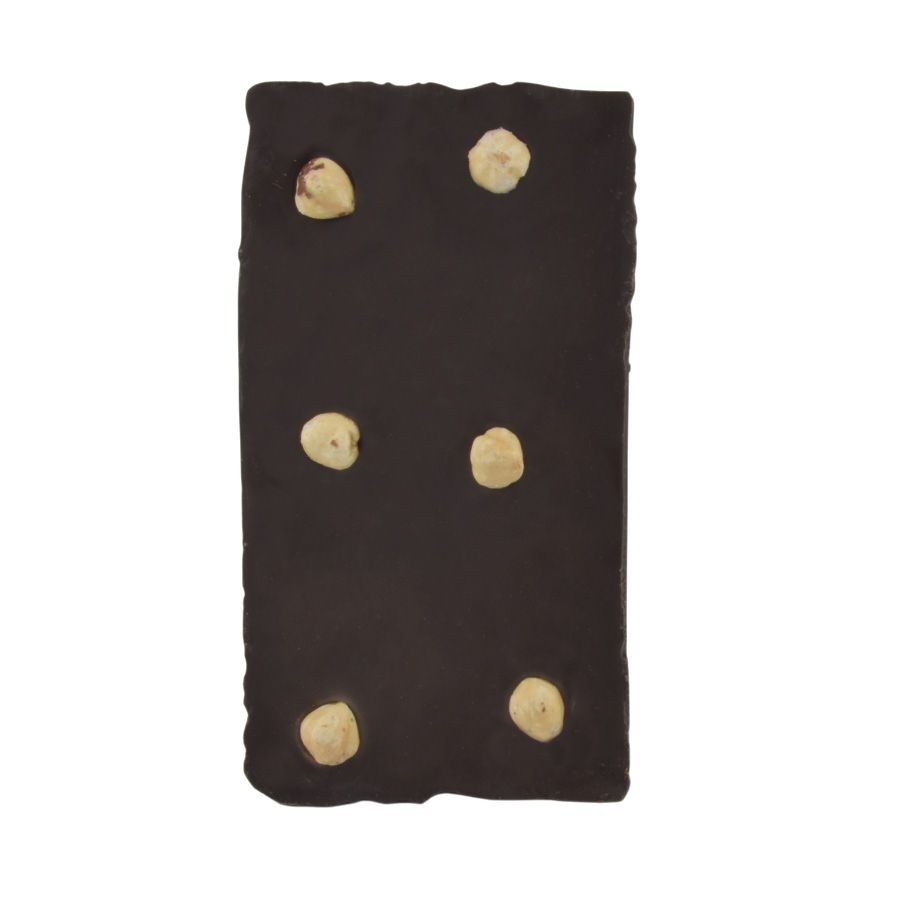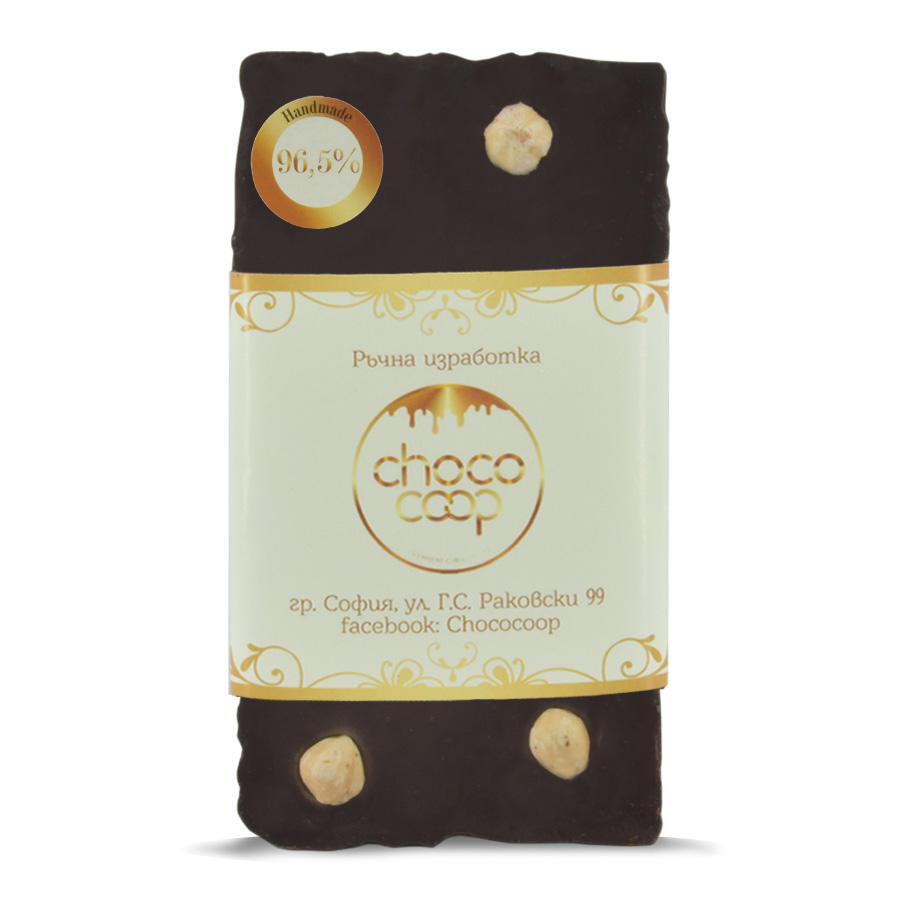 Съставки: Черен шоколадов кувертюр (82%) – страна на произход ЕС, какаово масло (52,5%), суха обезмаслена какаова маса (44%), може да съдържа следи от мляко и соеви продукти, поръска: ядки от лешници (18%). Какаово съдържание – минимум 79.13%.