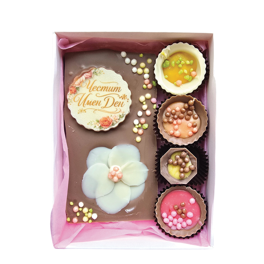 Кутия “Имен ден” с млечен шоколад картичка и бонбони