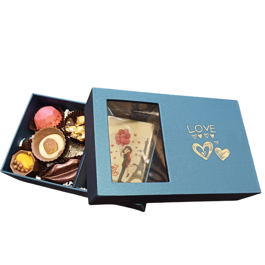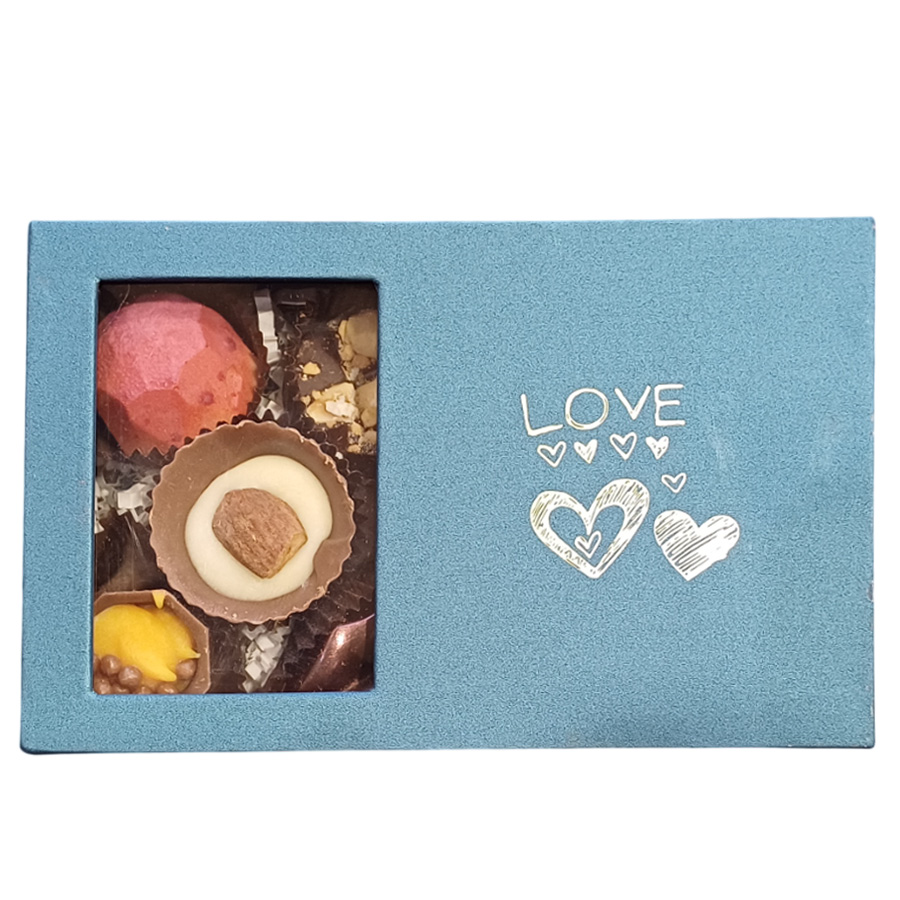 Кутията съдържа ръчно изработени бонбони „Асорти“ с различни видове пълнеж, 5 бр. и шоколадова визитка с принт