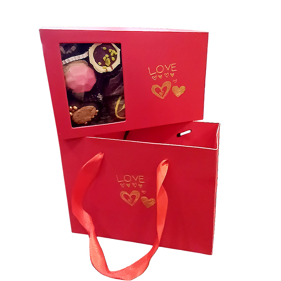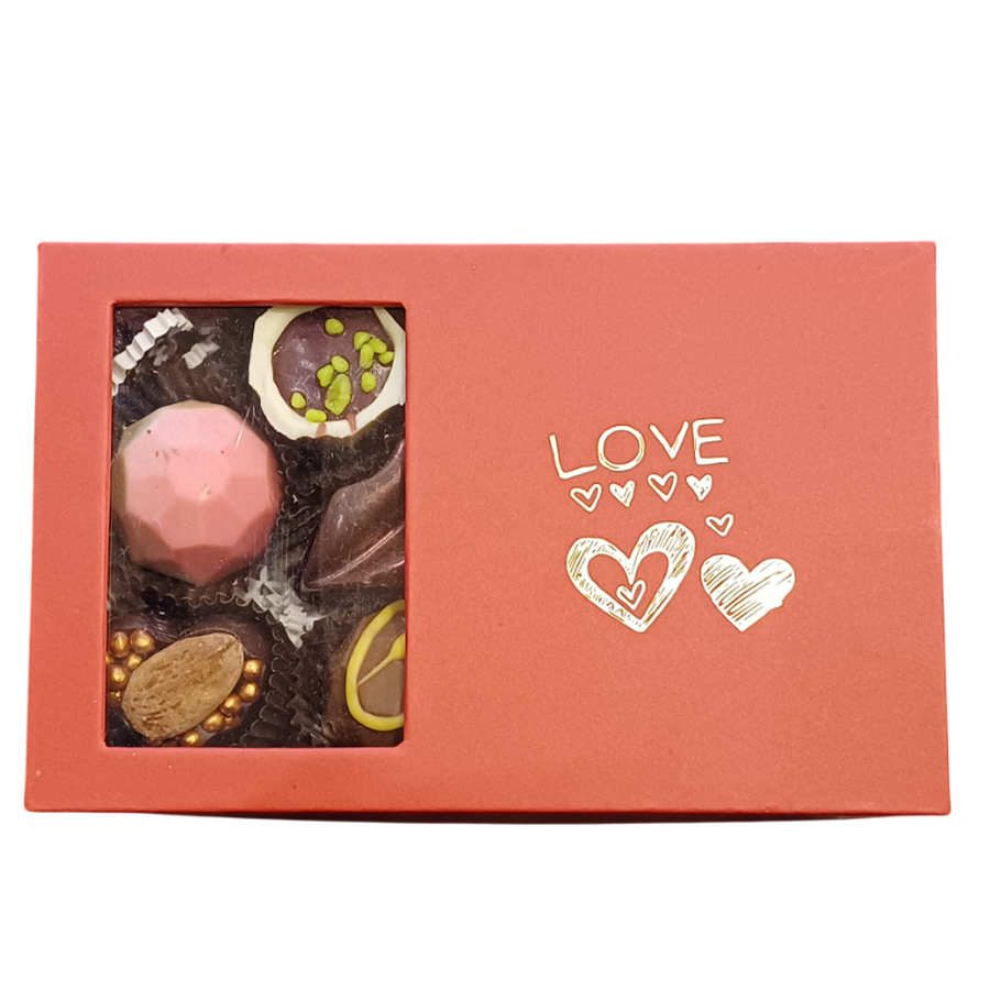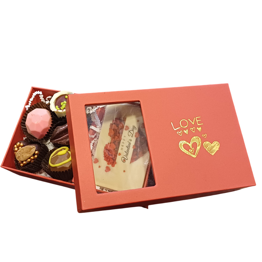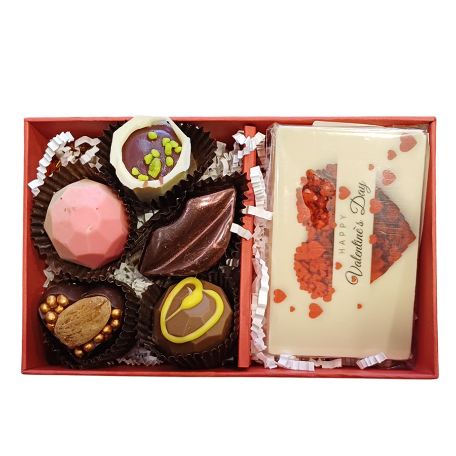 Кутията съдържа ръчно изработени бонбони „Асорти“ с различни видове пълнеж, 5 бр. и шоколадова визитка с принт