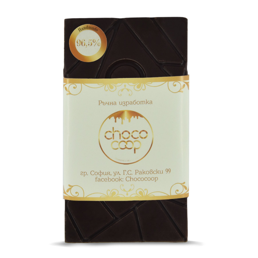 Съставки: Черен шоколадов кувертюр – страна на произход ЕС, какаово масло (52,5%), суха обезмаслена какаова маса (44%), може да съдържа следи от мляко и соеви продукти. Какаово съдържание – минимум 96%.